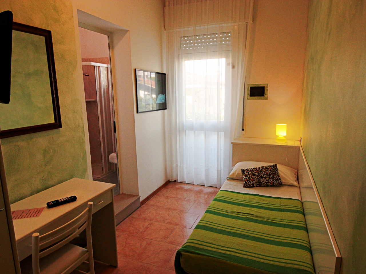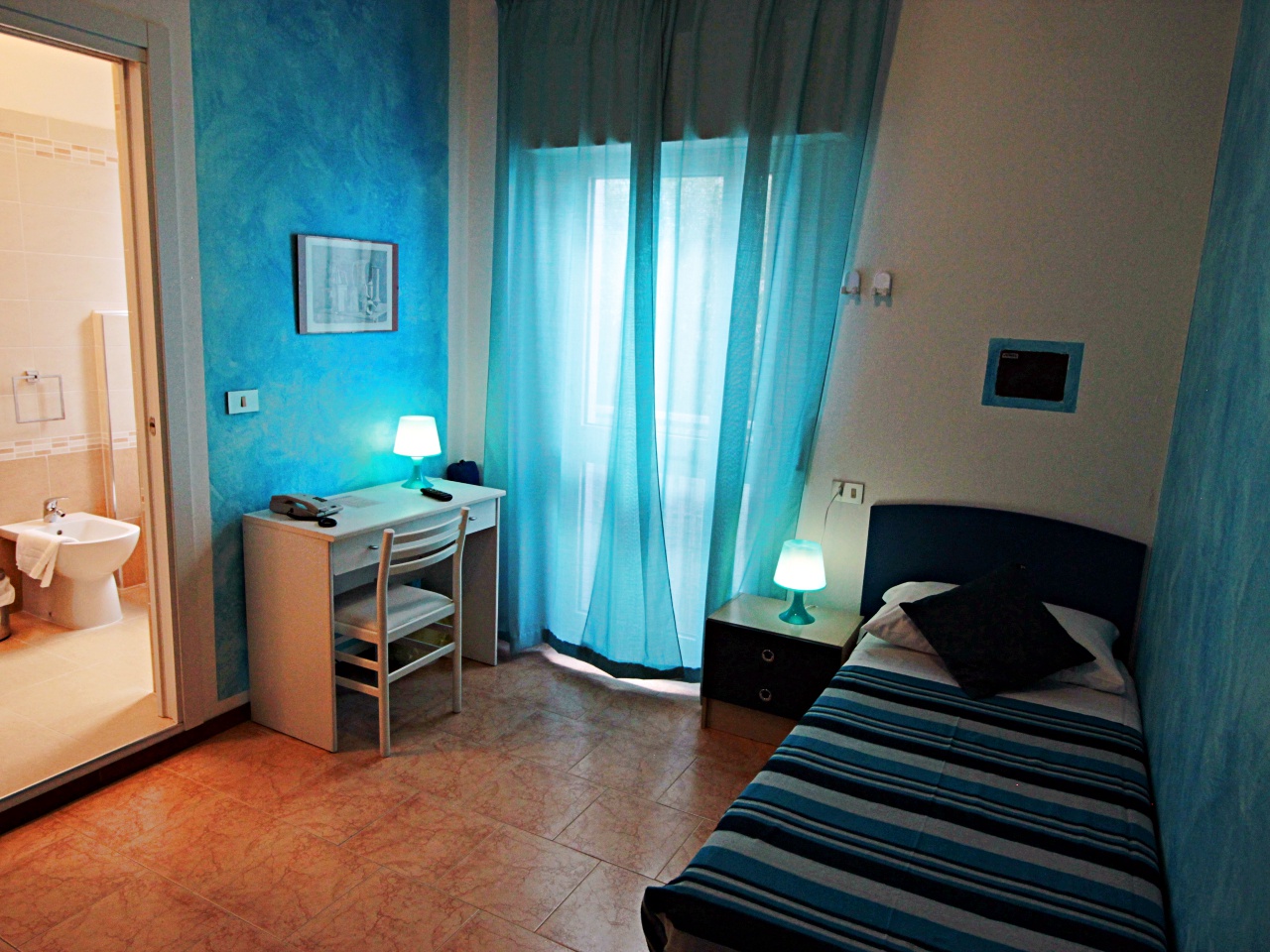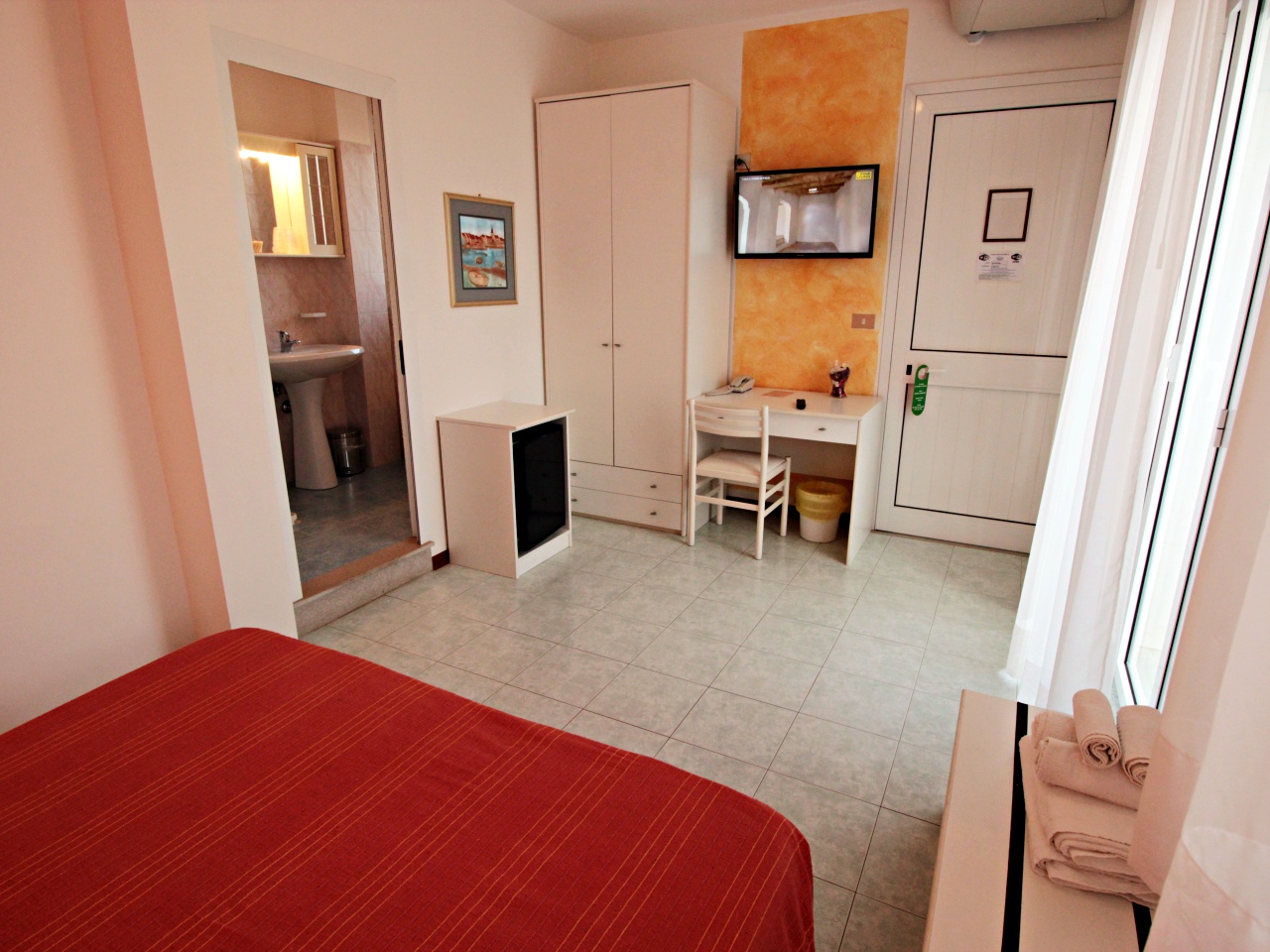 Die Zimmer sind einfach und geschmackvoll eingerichtet, ausgestattet mit Dusche, WC, Haarfön, Sprechanlage, Kühlschrank, Sat-TV, Klimaanlage, Heizung, Safe und Balkon.